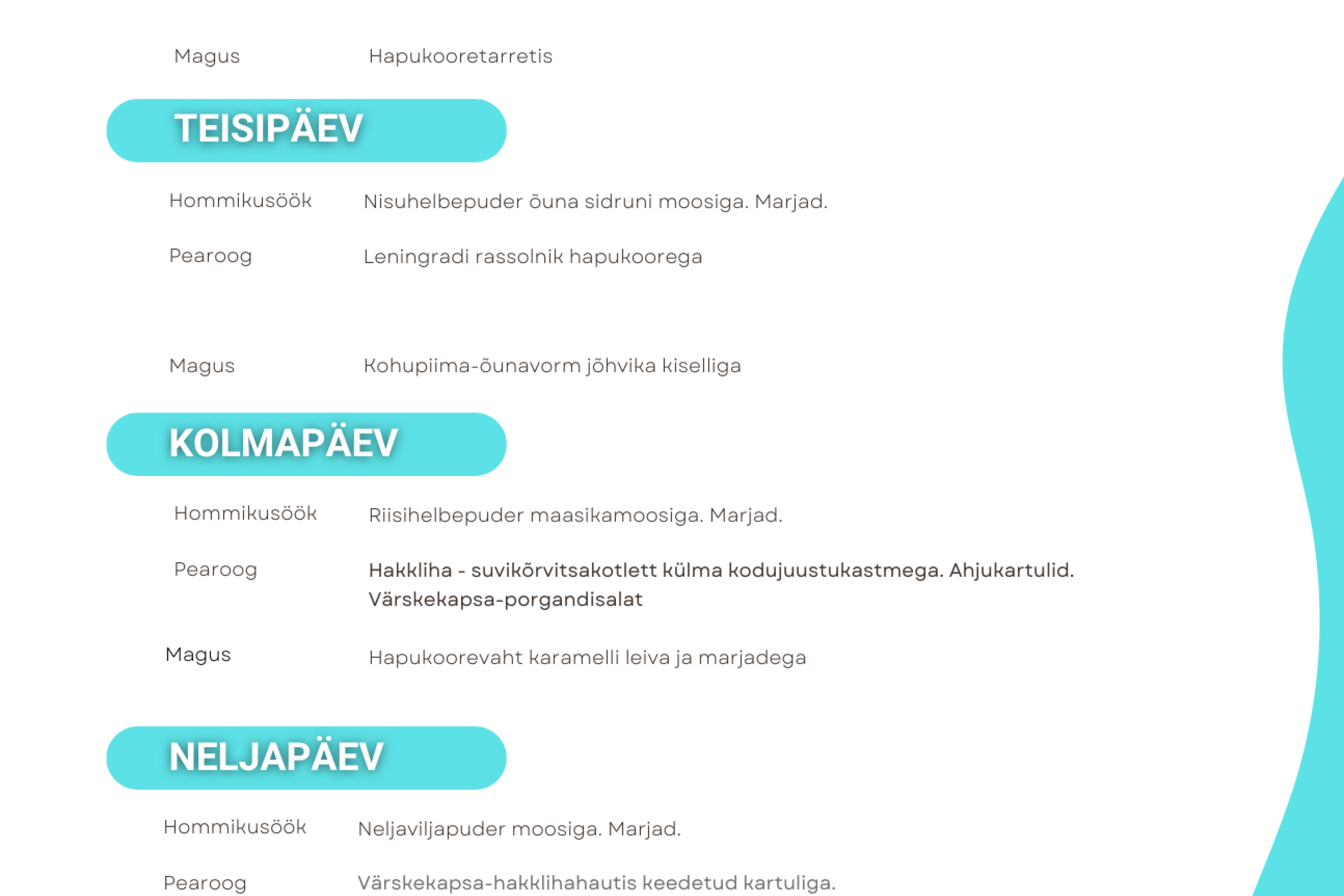 - Hommikusöök: Rukkihelbepuder õunamoosiga. Marjad