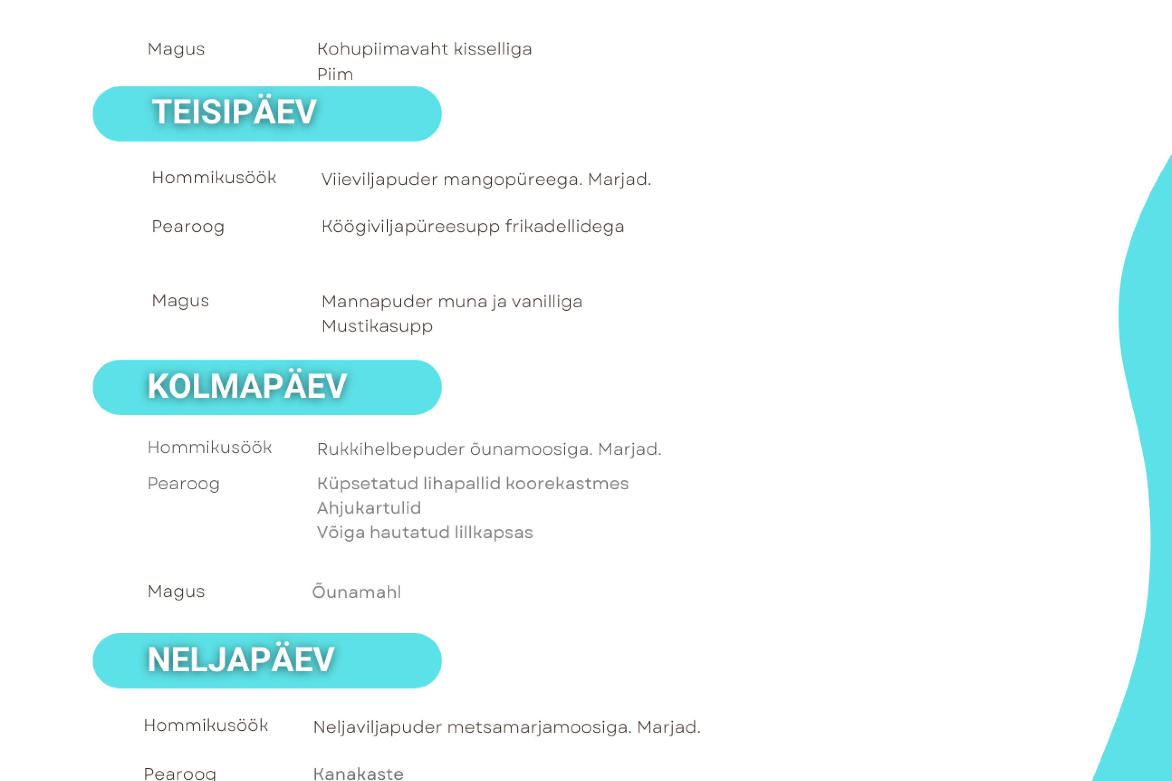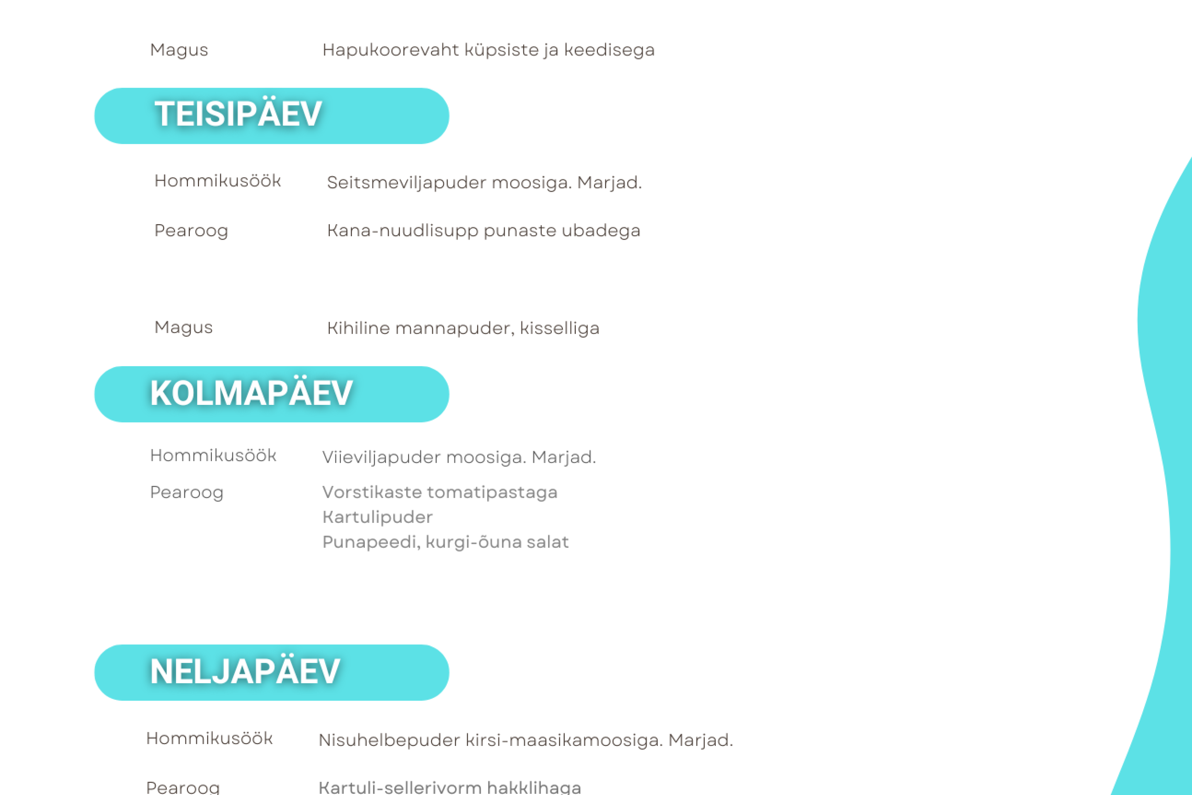 - Hommikusöök: Kaerahelbepuder, maasikamoos. Marjad.
