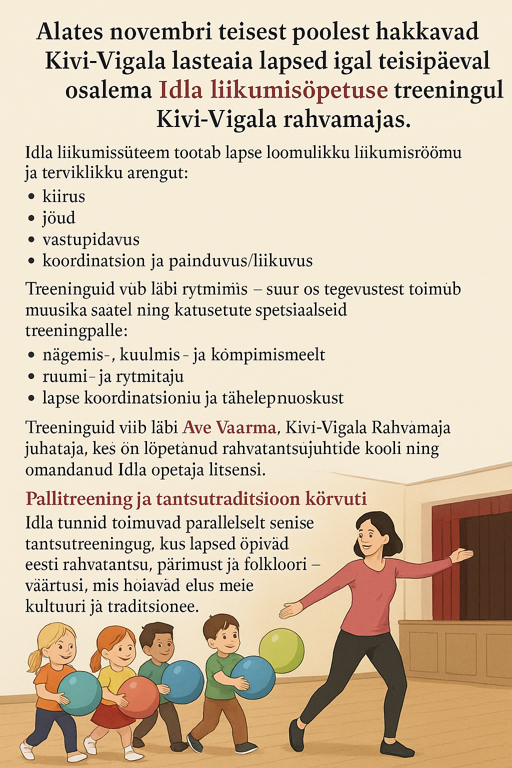 Alates novembri teisest poolest hakkavad Kivi-Vigala lasteaia lapsed igal teisipäeval osalema Idla liikumisõpetuse treeningul Kivi-Vigala rahvamajas.